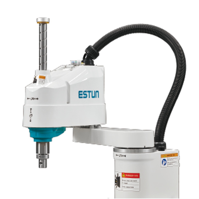 O ESTUN ER10-500-SR apresenta uma estrutura SCARA de quatro eixos que consiste em duas juntas rotativas para movimento plano, um eixo linear vertical para movimento ascendente e descendente e um eixo rotativo para orientação do efetor final. Esta configuração suporta posicionamento horizontal rápido combinado com inserção vertical precisa, o que é essencial para tarefas como colocação de componentes, fixação de parafuso e operações de pressão.